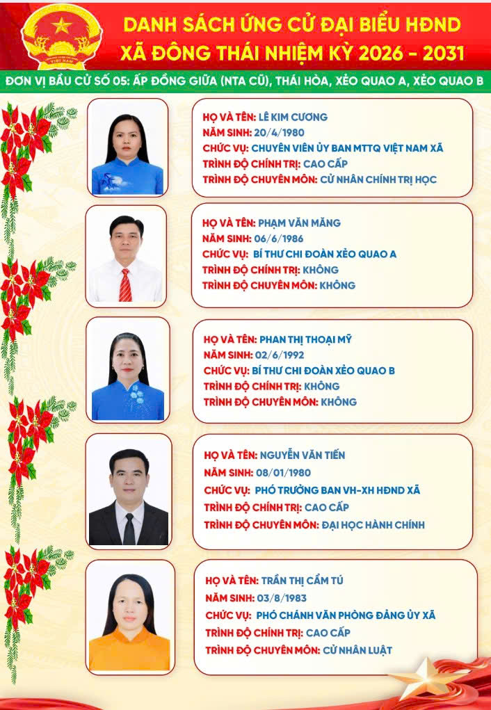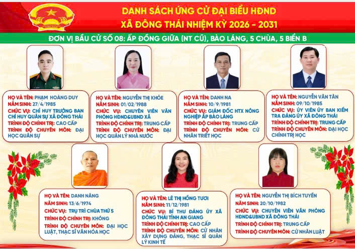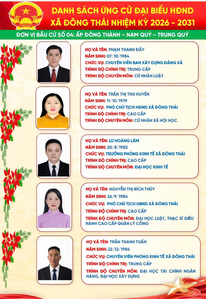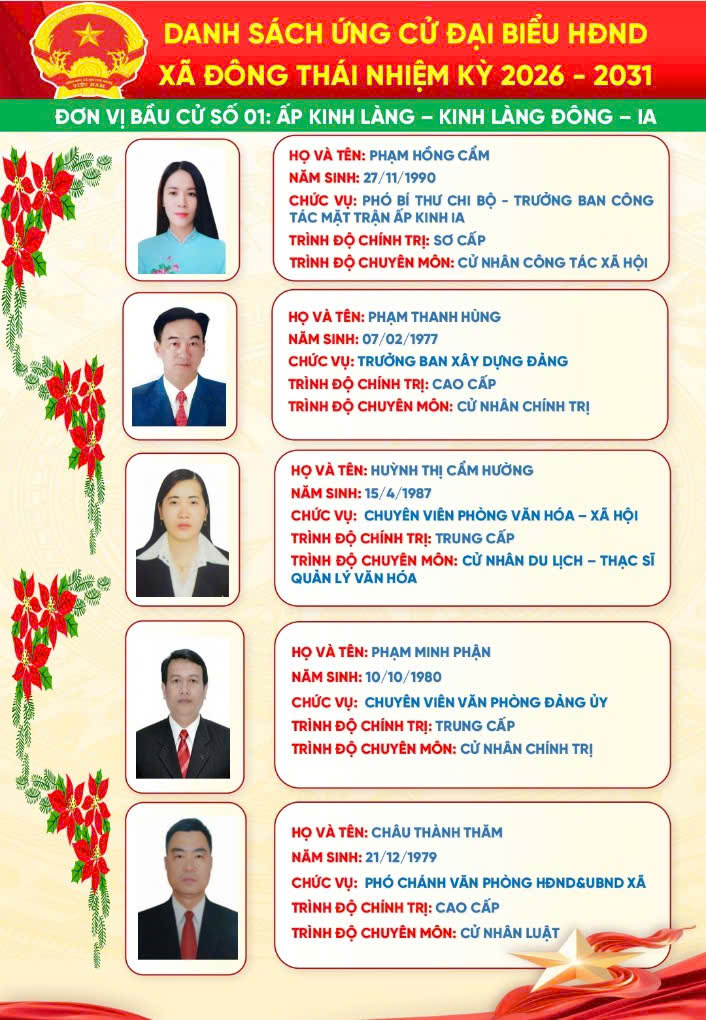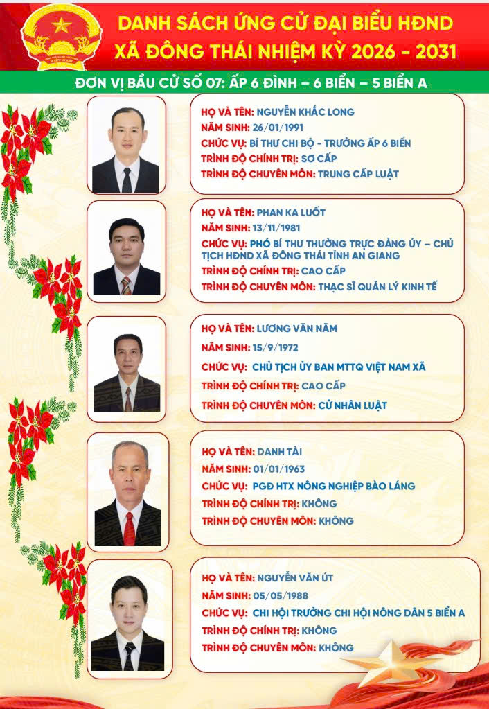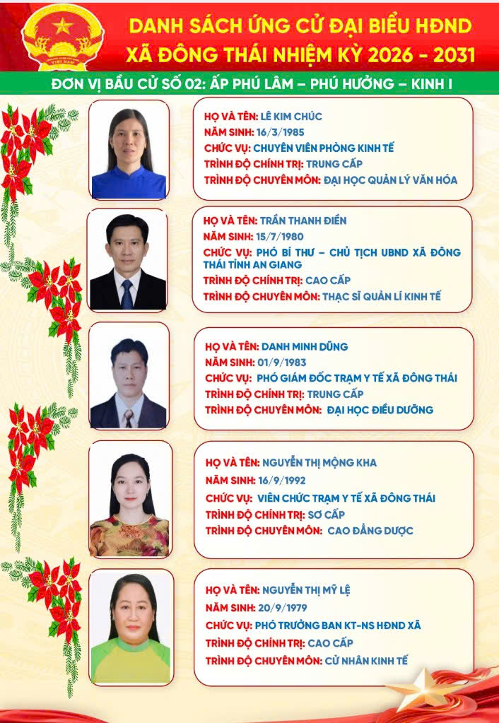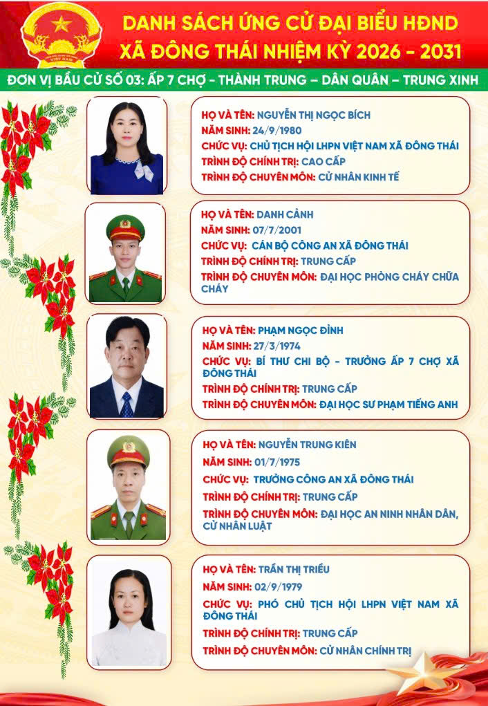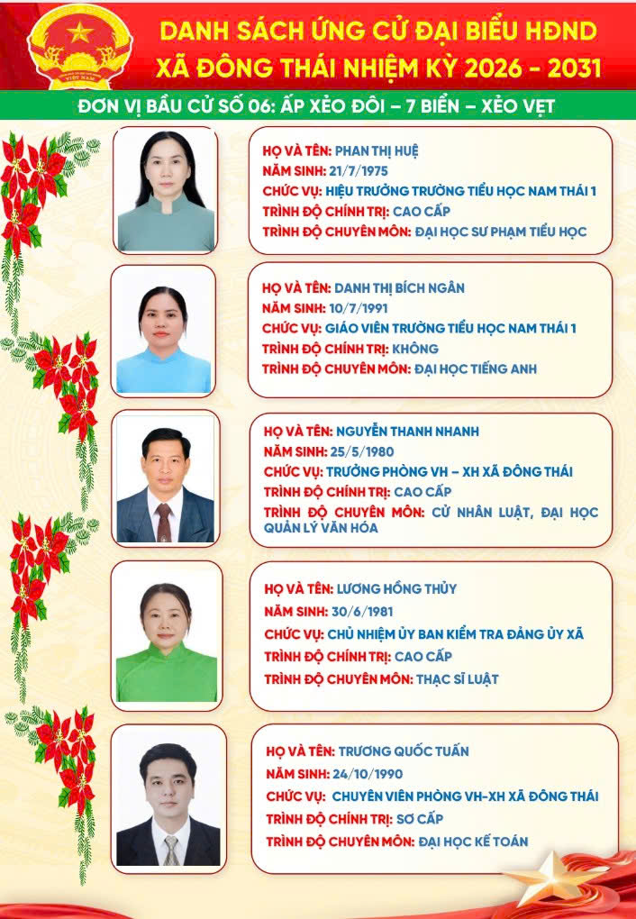 Trang Chủ Xã Đông Thái tổ chức Lễ khởi công cầu ngang ấp Thái Hòa – giáp ấp Đồng Giữa Tin tức sự kiện nổi bật Xã Đông Thái tổ chức Lễ khởi công cầu ngang ấp Thái Hòa – giáp ấp Đồng Giữa Xã Đông Thái triển khai đăng ký danh hiệu nông dân sản xuất kinh doanh giỏi năm 2026 bằng hình thức trực tuyến ĐÔNG THÁI: TIẾP VÀ LÀM VIỆC VỚI ĐOÀN CÔNG TÁC CỦA TỈNH VỀ KHẢO SÁT THỰC TẾ PHỤC VỤ CÔNG NHẬN XÃ ĐÔNG THÁI LÀ XÃ AN TOÀN KHU. ĐOÀN CÔNG TÁC TỈNH AN GIANG THĂM, CHÚC TẾT CHÔL CHNĂM THMÂY TẠI XÃ ĐÔNG THÁI Đông Thái tổ chức Kỳ họp thứ 2 (kỳ họp chuyên đề) HĐND xã khóa XIII, nhiệm kỳ 2026–2031 Đông Thái khánh thành cầu giao thông nông thôn ấp Thái Hòa – Lan tỏa nghĩa tình vì cộng đồng ĐÔNG THÁI TỔ CHỨC KỲ HỌP THỨ NHẤT HĐND XÃ KHÓA XIII, NHIỆM KỲ 2026 – 2031 Xã Đông Thái tổ chức Hội nghị công bố Quyết định và tổ chức Phiên họp lần thứ nhất Ban đại diện Hội đồng quản trị Ngân hàng Chính sách xã hội xã Cái nôi đào tạo nhân tài của An Giang Đại hội đại biểu Đảng bộ Ủy ban nhân dân tỉnh An Giang lần thứ I, nhiệm kỳ 2025 – 2030 THÔNG TIN ĐƯỜNG DÂY NÓNGXÃ ĐÔNG THÁI Ông: Nguyễn Văn A Điện thoại: 0296.701.234 Email: @angiang.gov.vn Công an xã Đông Thái Điện thoại: 0297.123.123 KIỂM SOÁT TTHCXÃ ĐÔNG THÁI Ông: Nguyễn Văn B Điện thoại: 0296.312.312 Email: @angiang.gov.vn Đảng - Đoàn thể Đại hội đại biểu Đảng bộ Ủy ban nhân dân tỉnh An Giang lần thứ I, nhiệm kỳ 2025 – 2030 Hành trình tình nguyện đến vùng biên giới An Giang An Giang: Đảm bảo an ninh, trật tự dịp Lễ Quốc khánh 2/9 Thông báo khám chữa bệnh miễn phí cho khách hàng có thẻ BHYT Tổng kết "Phong trào toàn dân bảo vệ An ninh Tổ Quốc" năm 2021 Hoạt động HĐND - UBND Xã Đông Thái tổ chức Lễ khởi công cầu ngang ấp Thái Hòa – giáp ấp Đồng Giữa Xã Đông Thái triển khai đăng ký danh hiệu nông dân sản xuất kinh doanh giỏi năm 2026 bằng hình thức trực tuyến ĐÔNG THÁI: TIẾP VÀ LÀM VIỆC VỚI ĐOÀN CÔNG TÁC CỦA TỈNH VỀ KHẢO SÁT THỰC TẾ PHỤC VỤ CÔNG NHẬN XÃ ĐÔNG THÁI LÀ XÃ AN TOÀN KHU. ĐOÀN CÔNG TÁC TỈNH AN GIANG THĂM, CHÚC TẾT CHÔL CHNĂM THMÂY TẠI XÃ ĐÔNG THÁI Đông Thái tổ chức Kỳ họp thứ 2 (kỳ họp chuyên đề) HĐND xã khóa XIII, nhiệm kỳ 2026–2031 Kinh tế - Hạ tầng An Giang: Đảm bảo an ninh, trật tự dịp Lễ Quốc khánh 2/9 Thông báo khám chữa bệnh miễn phí cho khách hàng có thẻ BHYT Tổng kết "Phong trào toàn dân bảo vệ An ninh Tổ Quốc" năm 2021 Văn hóa - Giáo dục - Y tế An Giang tăng cường phòng, chống bệnh Chikungunya Thông báo khám chữa bệnh miễn phí cho khách hàng có thẻ BHYT Tổng kết "Phong trào toàn dân bảo vệ An ninh Tổ Quốc" năm 2021 Tết cổ truyền Chol Chnam Thmay An sinh - Xã hội Cái nôi đào tạo nhân tài của An Giang An Giang: Đảm bảo an ninh, trật tự dịp Lễ Quốc khánh 2/9 Tổng kết "Phong trào toàn dân bảo vệ An ninh Tổ Quốc" năm 2021 Tết cổ truyền Chol Chnam Thmay Quốc phòng - An ninh Bộ đội Biên phòng tỉnh An Giang phát động thi đua cao điểm chống khai thác IUU Thực tập phương án chữa cháy và cứu nạn cứu hộ tại Chi nhánh công ty cổ phần rau quả thực phẩm An Giang Thành lập Hội Phụ nữ Ban Chỉ huy Bộ đội Biên phòng tỉnh An Giang An Giang: Đảm bảo an ninh, trật tự dịp Lễ Quốc khánh 2/9 Chuyên mục Báo cáo thống kê Cải cách hành chính Chính sách ưu đãi đầu tư Công khai ngân sách Danh sách người có công Danh sách hộ nghèo, cận nghèo Đề tài nghiên cứu khoa học Dự án, chương trình đầu tư Giải quyết khiếu nại - tố cáo Khen thưởng xử phạt trong QLNN Nông thôn mới Phổ biến giáo dục pháp luật Phòng chống tham nhũng Quy hoạch - Đề án Sản phẩm địa phương Thông báo Thông tin dịch bệch Tiếp cận thông tin Liên kết trang Sở, Ban, Ngành Đơn vị khác Xã, Phường, Đặc khu VP Đoàn ĐBQH và HĐND tỉnh Văn phòng UBND tỉnh Sở Giáo dục và Đào tạo Sở Dân tộc và Tôn giáo Sở Khoa học và Công nghệ Sở Xây dựng Sở Nội vụ Sở Nông nghiệp và Môi trường Sở Tài chính Sở Tư pháp Sở Văn hóa và Thể thao Sở Du lịch Sở Y tế Công an tỉnh Thanh tra Tỉnh Ban Quản lý Khu kinh tế Ban Quản lý Khu kinh tế Phú Quốc Ban Tuyên giáo Tỉnh ủy Ban Tiếp công dân tỉnh Bảo hiểm xã hội tỉnh Cục hải quan Cục thuế tỉnh Hội Nông dân tỉnh Kho bạc nhà nước tỉnh An Giang Liên đoàn Lao động tỉnh Trường chính trị Tôn Đức Thắng Viện kiểm sát Ủy ban MTTQ Việt Nam tỉnh Tỉnh đoàn An Giang Hội liên hiệp phụ nữ tỉnh An Giang Hiệp hội Thủy sản tỉnh An Giang Hiệp hội doanh nghiệp Thông báo Bản tin đột xuất nhận định mưa lũ trên lưu vực sông Mê Công và vùng ĐBSCL do ảnh hưởng của cơn bão số 5 - (25/08/2025) Tin bão Khẩn cấp(Cơn bão số 5) Tin cuối cùng về cơn bão số 5 Thư viện ảnh Tiểu sử bầu cử đại biểu Hội đồng nhân dân xã Đông Thái, nhiệm kỳ 2026-2031 Phú Quốc Khu Du Lịch Núi Cấm Rừng Tràm Trà Sư Miếu Bà Chúa Xứ Thăm dò ý kiến Thư viện Video Đại hội đại biểu Đảng bộ tỉnh An Giang lần thứ I, nhiệm kỳ 